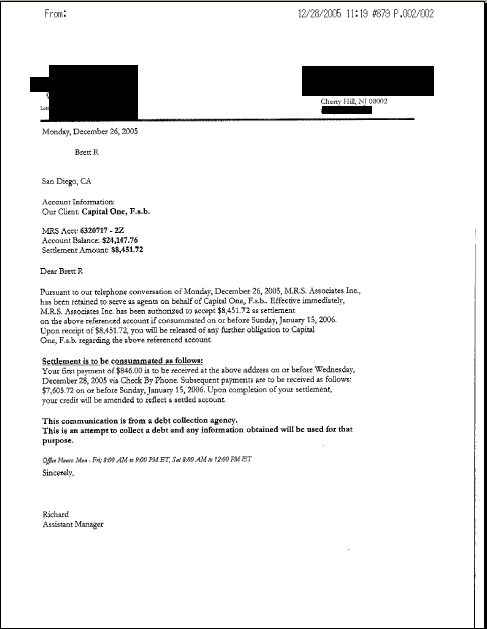 Carta de Liquidación de Deuda de Capital One Diciembre 2005