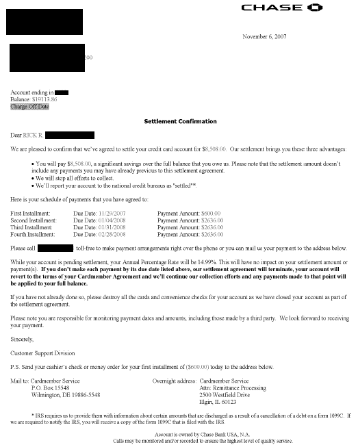 Carta de liquidación de deuda de Chase noviembre de 2007