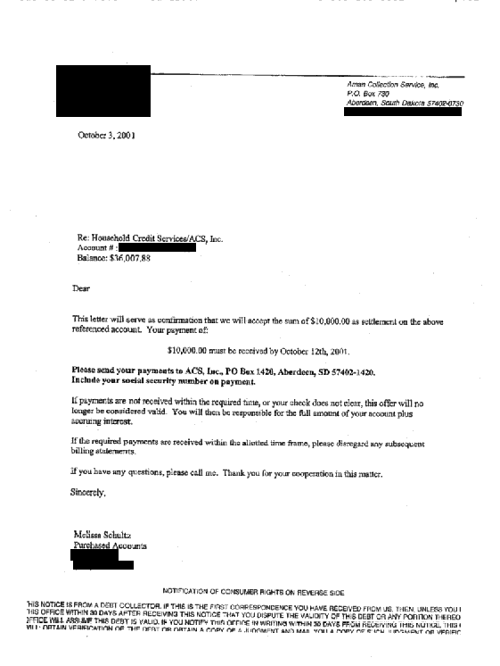 Lo siguiente es una liquidación de deuda para Household. En la carta, puede ver la resolución final negociada donde el cliente ahorró un 72%. Pagaron solo $10,000 del saldo adeudado de $36,007.