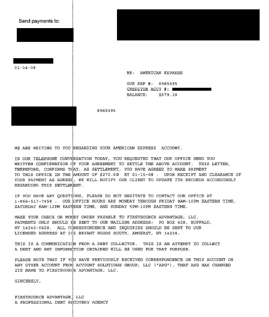 Central Credit Services Inc. Carta de liquidación de deuda diciembre de 2007