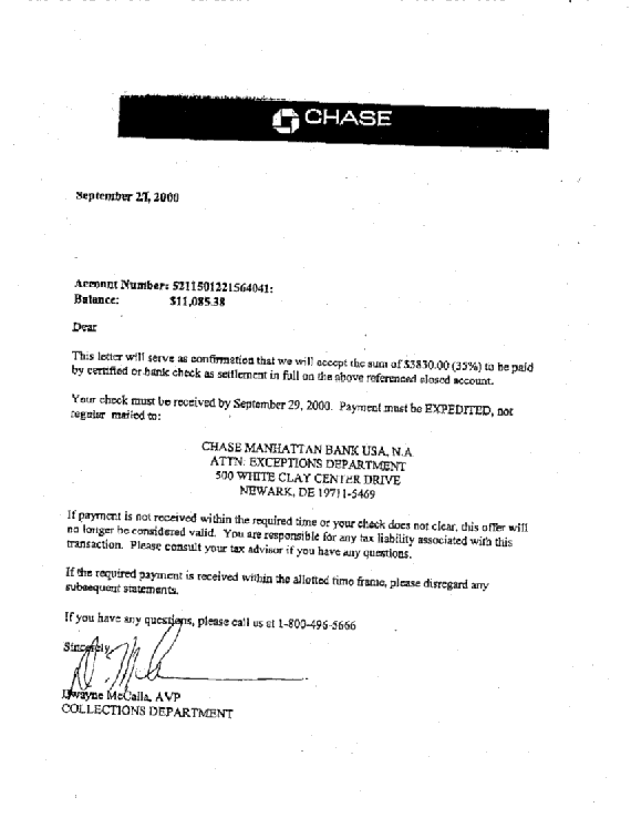 Carta de Liquidación de Deuda de Chase Septiembre 2000