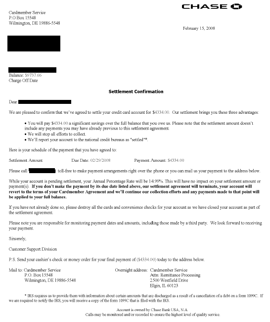 Carta de Liquidación de Deuda de Chase Bank Febrero 2008
