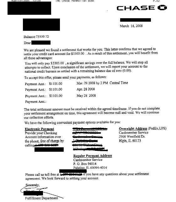 Lo siguiente es una carta de acuerdo de deuda para una cuenta con Chase Bank. En la carta, puede ver la resolución final negociada donde el cliente ahorró un 55%. Solo pagaron $3,303.00 del saldo adeudado de $7,339.72.