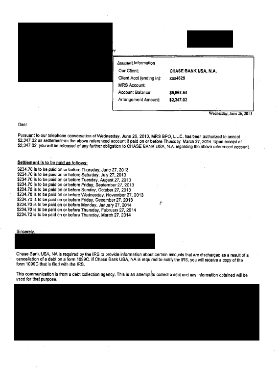 Carta de Liquidación de Deuda de Chase Bank Junio 2013