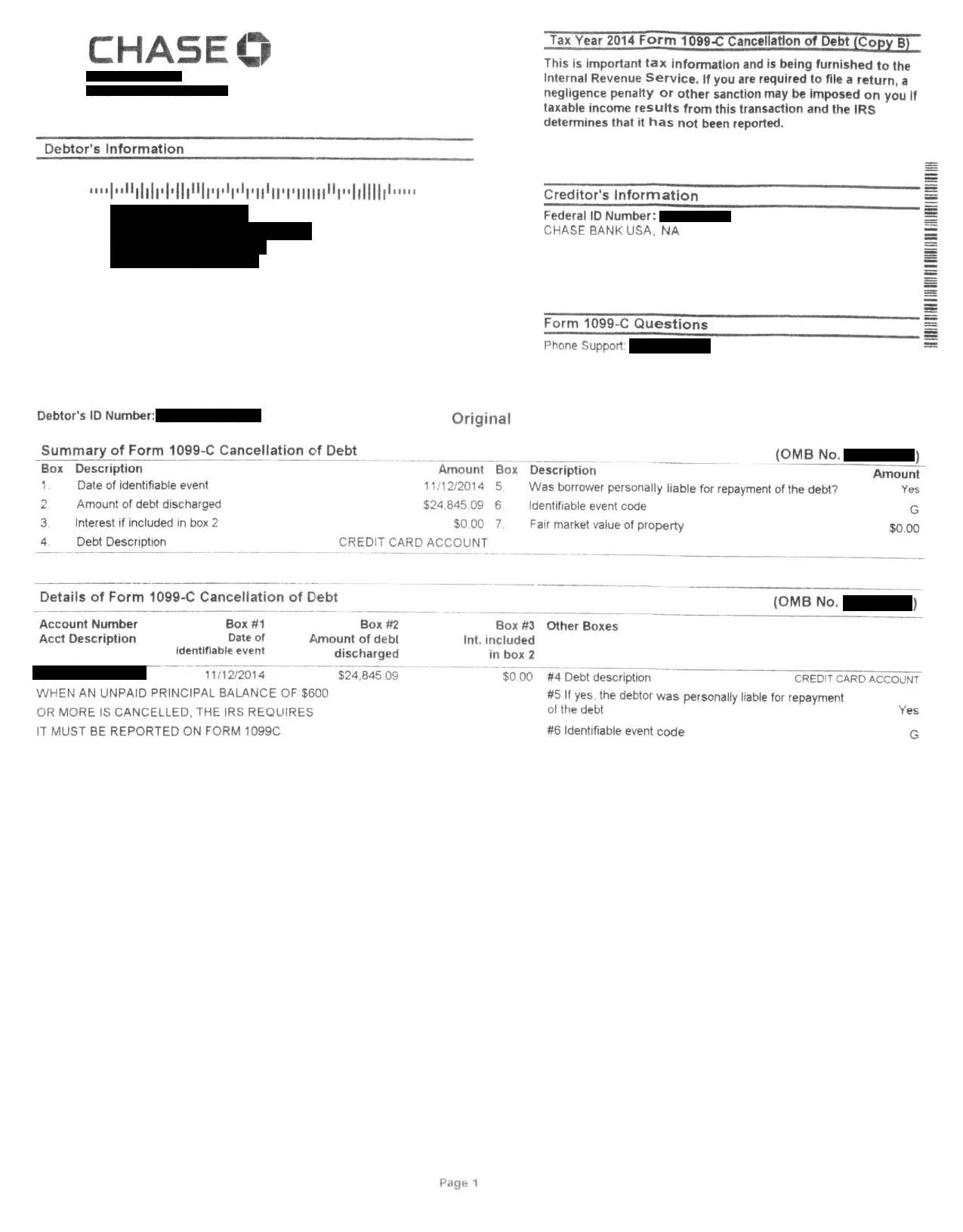 Carta de liquidación de deuda del Chase Bank USA America de noviembre de 2014