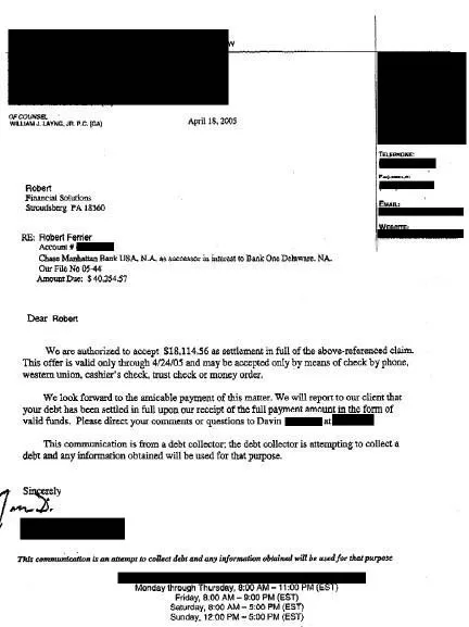 Carta de Liquidación de Deuda de Chase, Abril 2005
