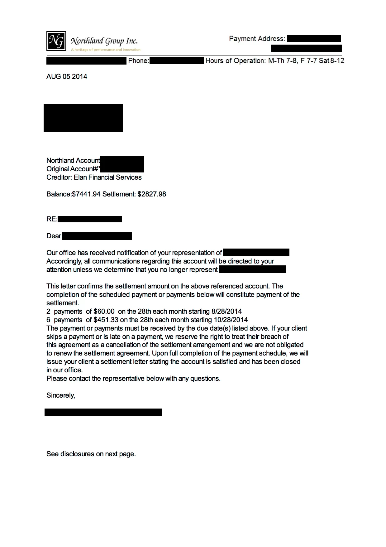 Lo siguiente es una carta de liquidación de deuda para una cuenta con Elan Financial Services. En la carta, puede ver la resolución final negociada donde el cliente ahorró un 62%. Solo pagaron $2,827.98 del saldo adeudado de $7,441.94.