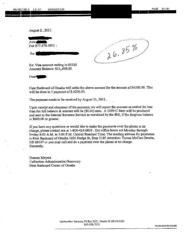 Carta de Liquidación de Deuda de First Bankcard of Omaha Agosto 2011