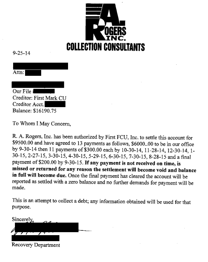 Primera carta de liquidación de deuda de First FCU de septiembre de 2014