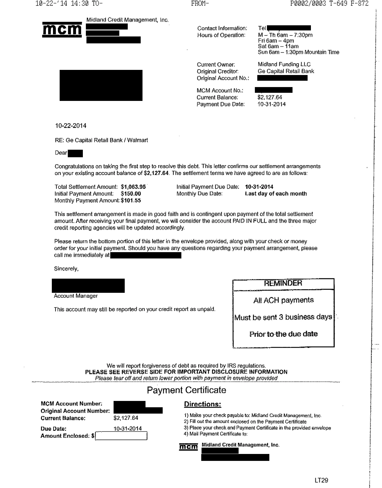 La siguiente es una carta de liquidación de deuda para una cuenta con el Banco Minorista Ge Capital. En la carta, puede ver la resolución final negociada donde el cliente ahorró el 50%. Pagaron solo $1,063.95 sobre el saldo adeudado de $2,127.64.