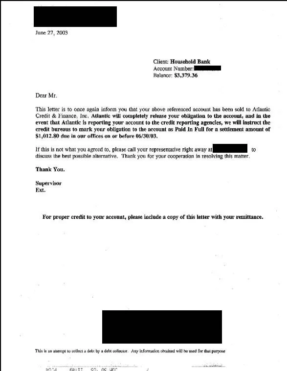 Lo siguiente es una carta de liquidación de deuda para Household. En la carta, puede ver la resolución final negociada donde el cliente ahorró un 70%. Solo pagaron $1,012.80 del saldo adeudado de $3,379.36.