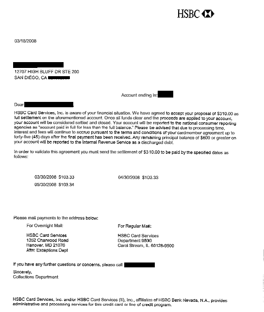 Lo siguiente es una carta de liquidación de deuda para HSBC. En la carta, puede ver la resolución final negociada donde el cliente ahorró 48%. Solo pagaron $310.00 del saldo adeudado de $600.00.