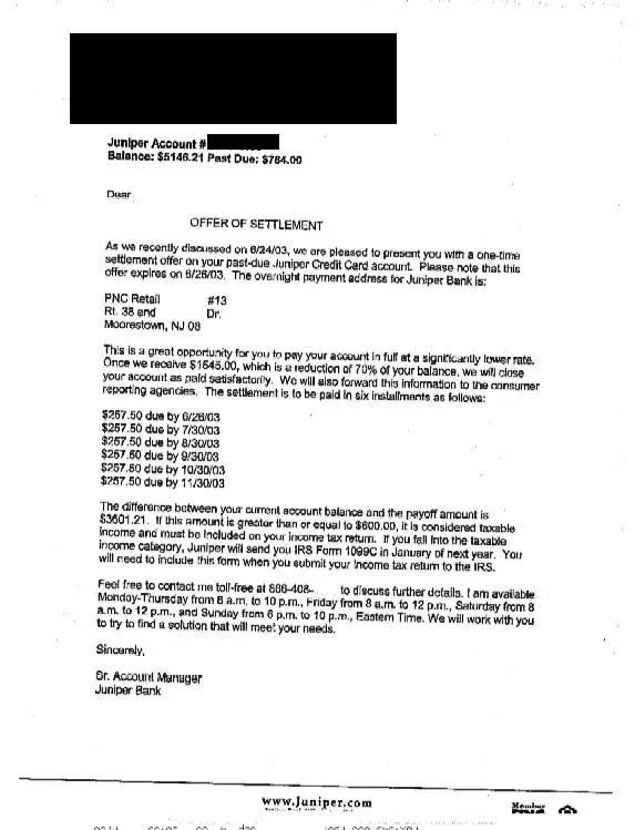 Lo siguiente es una carta de liquidación de deuda para Juniper. En la carta, se puede ver la resolución final negociada donde el cliente ahorró un 70%. Pagaron solo $1,545.00 del saldo adeudado de $5,146.21.