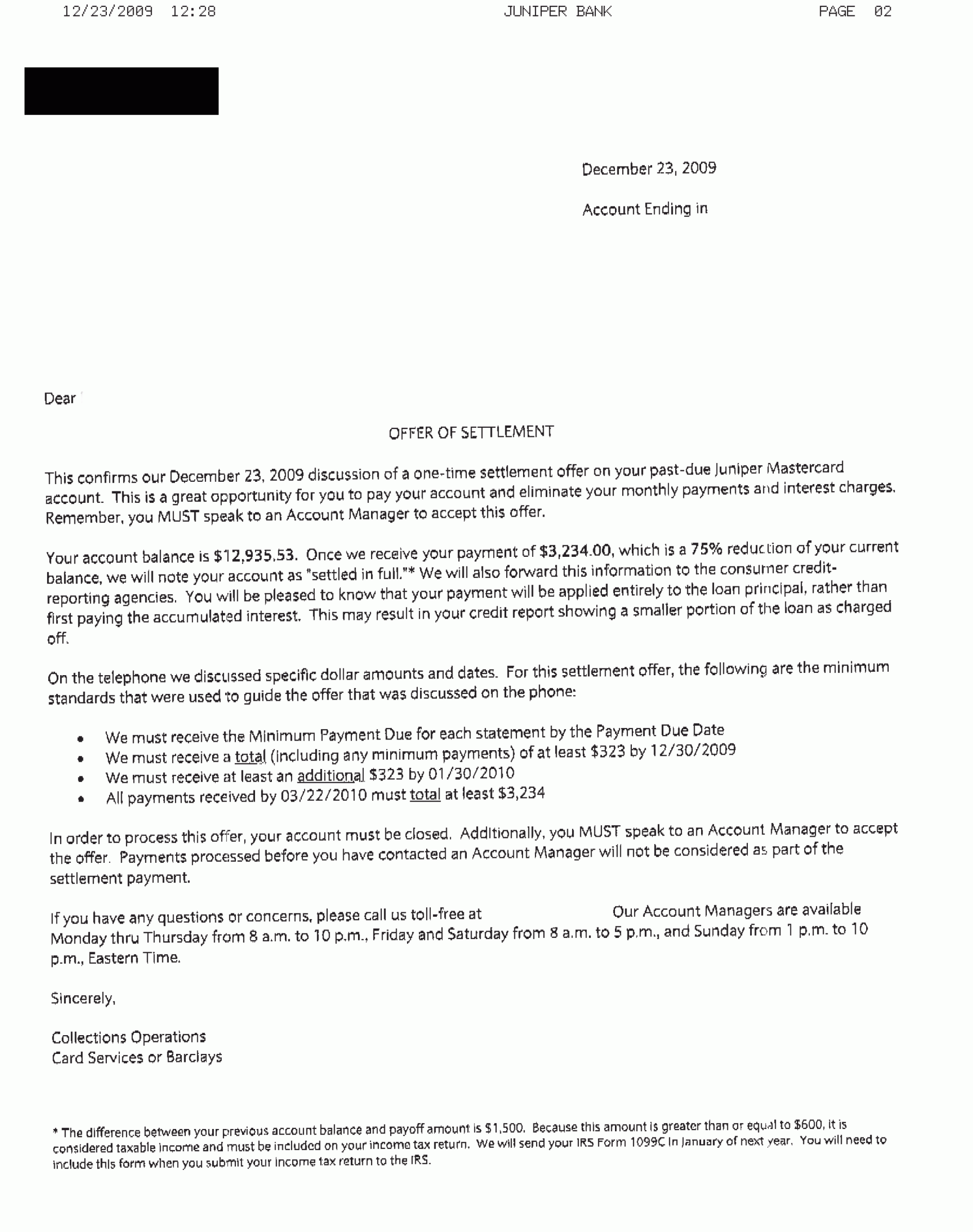 Carta de Liquidación de Deuda de la Tarjeta Master de Juniper Diciembre 2009