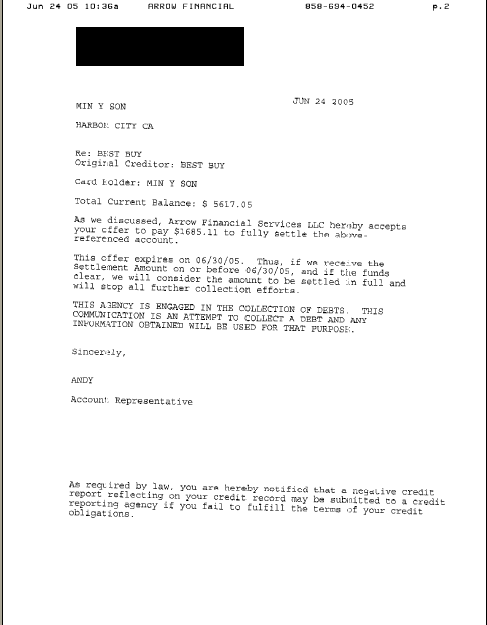 Carta de Liquidación de Deuda de Best Buy Junio 2005