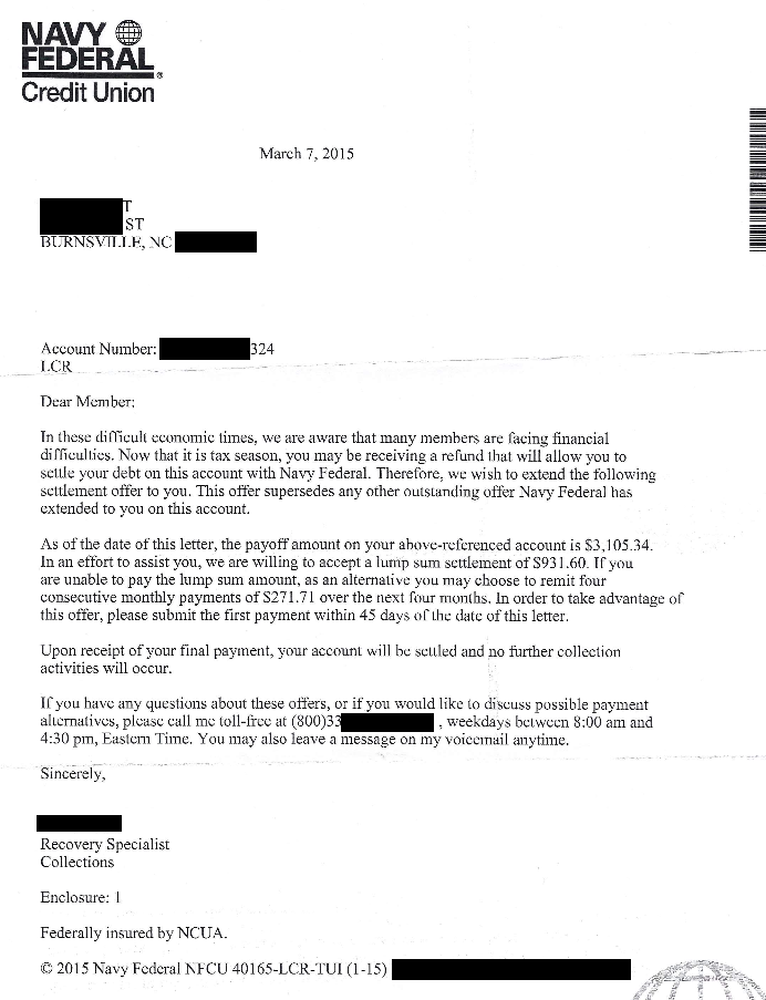 Carta de Liquidación de Deuda de Navy Federal de Marzo de 2015