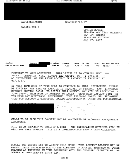 NCO Financial System Inc. Carta de Liquidación de Deuda Septiembre 2007