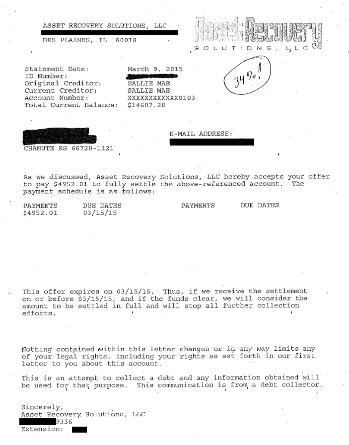 La siguiente es una carta de liquidación de deuda para Sallie Mae. En la carta, puedes ver la resolución final negociada donde el cliente ahorró un 66%. Solo pagaron $4,952.01 de un saldo adeudado de $14,607.28.