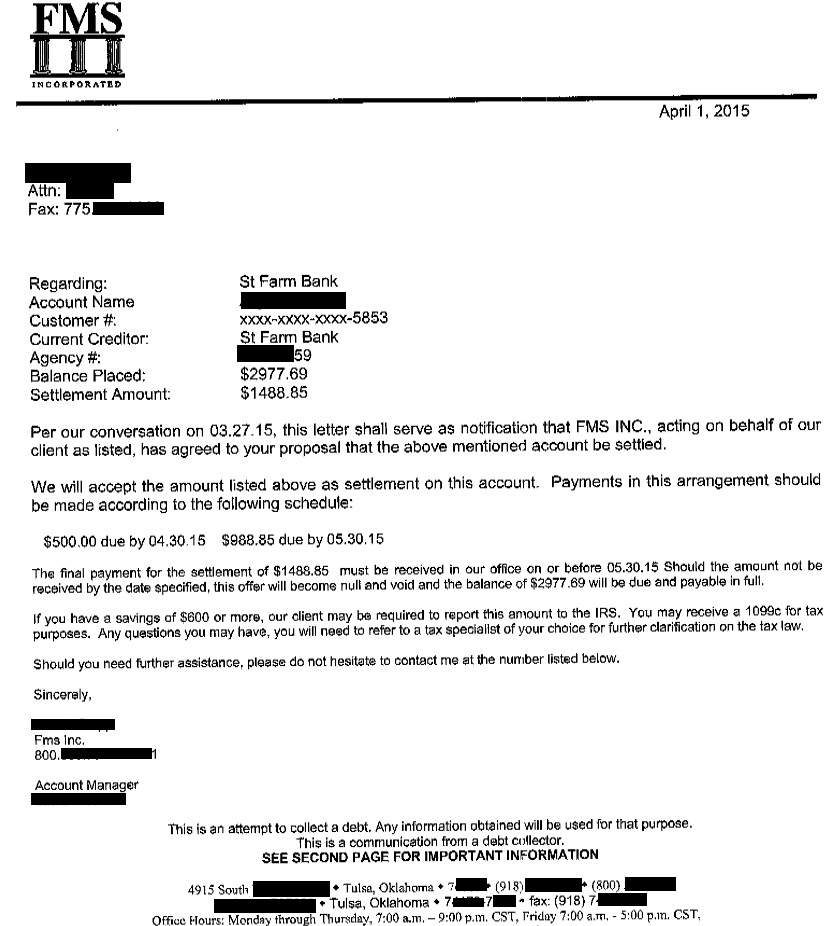 Carta de Liquidación de Deuda con State Farm Bank de Abril de 2015