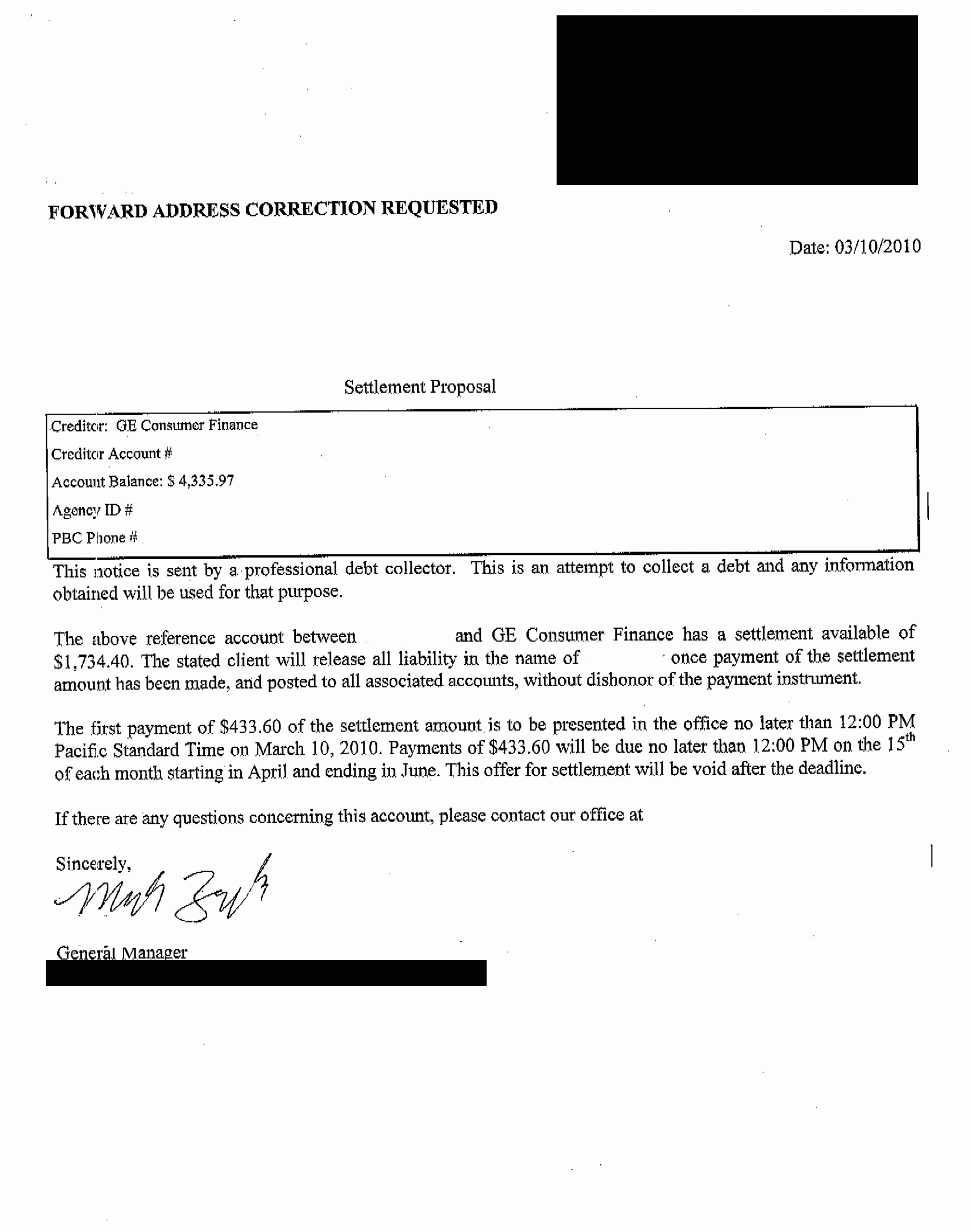La siguiente es una carta de liquidación de deuda para Walmart. En la carta, puede ver la resolución final negociada donde el cliente ahorró 60%. Sólo pagaron $1,734.40 sobre el saldo adeudado de $4,335.97.