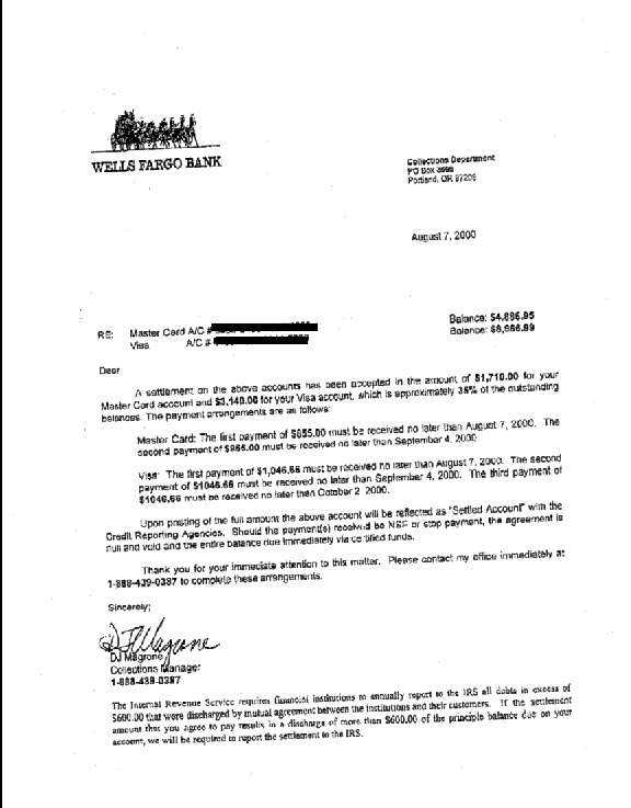 Carta de Liquidación de Deuda de Wells Fargo Agosto 2000