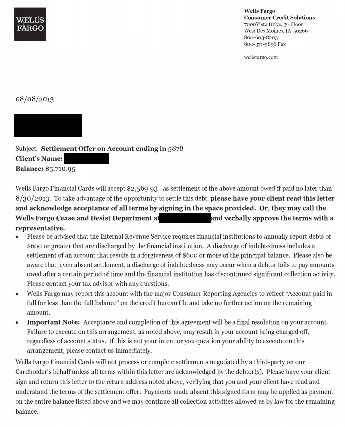 Carta de Liquidación de Deuda de Wells Fargo – Agosto 2013