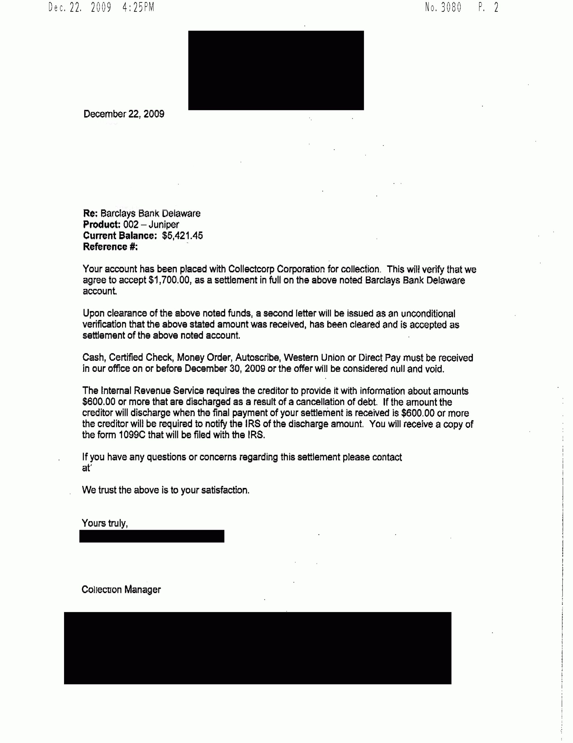 La siguiente es una carta de liquidación de deuda para Barclays Bank Delaware. En la carta, puede ver la resolución final negociada donde el cliente ahorró un 75%. Solo pagaron $1,700 del saldo adeudado de $5,421.45.