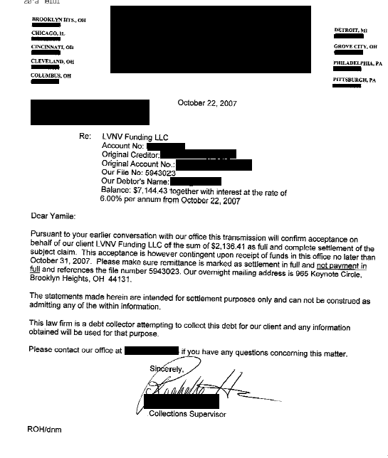 Carta de Liquidación de Deuda de Weltman, Weinberg & Reis Co. Octubre de 2007