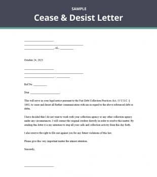 - Un enfoque más formal es enviar una carta de cese y desistimiento. Aunque los acreedores originales no están obligados por el FDCPA, aún pueden honrar tu solicitud para evitar la escalada o mala publicidad.