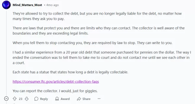 En los comentarios, alguien sugirió denunciar al acreedor ante las autoridades correspondientes y compartió un enlace útil sobre el plazo de prescripción de las deudas. Este marco legal limita cuánto tiempo un acreedor o agencia de cobro puede demandarte por una deuda impaga, y varía según el estado. Entender esto puede ser un cambio crucial al tratar con cobradores agresivos.