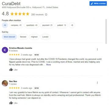 Puedes encontrar más historias como estas en Trustpilot, Google y BBB, donde nuestros clientes comparten su éxito con los servicios de alivio de deuda tributaria de CuraDebt.