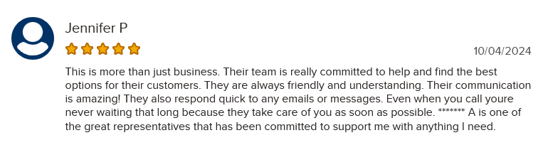 “Esto es más que solo negocios. Su equipo está realmente comprometido a ayudar y encontrar las mejores opciones para sus clientes. Siempre son amables y comprensivos. ¡Su comunicación es increíble! También responden rápidamente cualquier correo electrónico o mensaje. Incluso cuando llamas, nunca estás mucho tiempo esperando porque te atienden lo antes posible.”