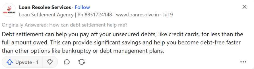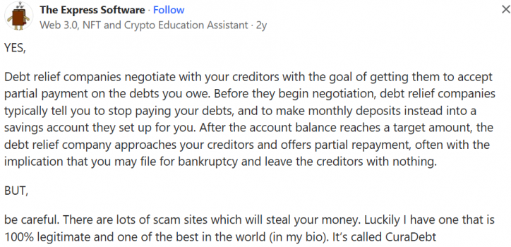 Por ejemplo, en Quora, un usuario preguntó, “¿Son legítimos los programas de alivio de deudas?” Alguien respondió afirmativamente, destacando la legitimidad de CuraDebt y su éxito en ayudar a los clientes. Otro post detalló los beneficios de la liquidación de deudas, resaltando cómo puede reducir significativamente las cargas de deuda mientras se evita la bancarrota.