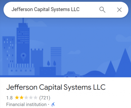 Jefferson Capital tiene una calificación promedio de 1.8/5 estrellas en Google. Los ejemplos incluyen: