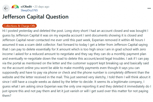 - Reseña Positiva: “Tenía una deuda de un préstamo de auto que fue vendido a Jefferson Capital Systems. Los llamé para negociar la deuda, y me dijeron que una vez la pagara, la deuda sería eliminada de mi informe de crédito dentro de 30 días. Hice el pago, y para mi sorpresa, ¡solo tomó una semana para que mi informe de crédito se limpiera!”