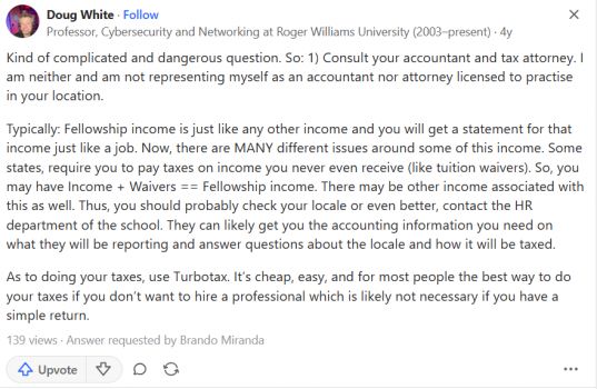 Por ejemplo, algunos usuarios de Reddit publicaron sus preguntas. Las respuestas sugirieron abrumadoramente hablar con un profesional de impuestos para ayudar a comprender las complejas reglas fiscales sobre financiación de posgrado.