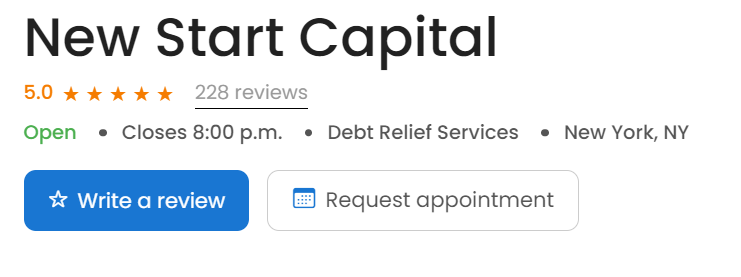 En cuanto a la reputación, New Start Capital no está acreditada por el Better Business Bureau (BBB), lo cual puede ser preocupante para algunos consumidores. Sin embargo, han recibido calificaciones altas en plataformas como Trustpilot, Birdeye y Google Reviews, donde muchos clientes han compartido sus experiencias con los servicios de la compañía.