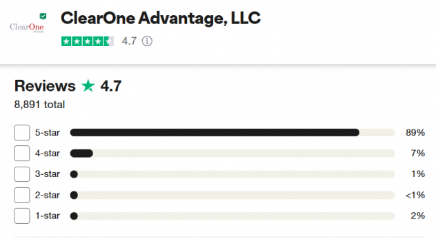 ClearOne Advantage tiene una buena calificación de la BBB, con un promedio de reseñas de clientes de 4.01 de 5. Los clientes a menudo destacan el equipo de soporte eficiente de la empresa, pero algunas quejas comunes incluyen malentendidos.