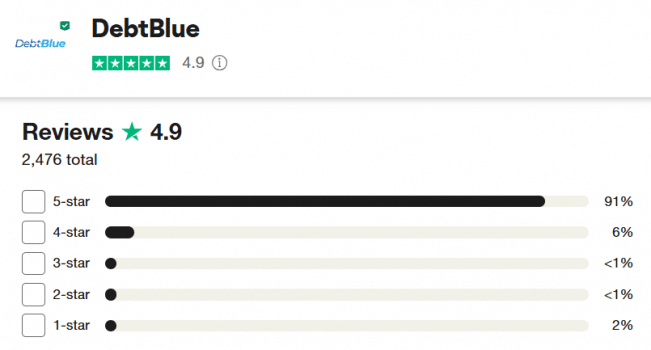 DebtBlue tiene una calificación promedio de Trustpilot de 4.9 estrellas, lo que indica un alto nivel de satisfacción entre la mayoría de los clientes. Aquí hay algunos ejemplos: