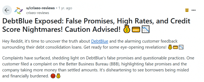 Si deseas aún más perspectivas sobre el servicio de una empresa, los foros en línea como Reddit pueden ofrecer perspectivas sin filtro. Por ejemplo, un usuario de Reddit compartió su experiencia, diciendo que mientras DebtBlue negoció efectivamente una menor cantidad de deuda, se sorprendieron por las tarifas, que resultaron ser más altas de lo inicialmente esperado.