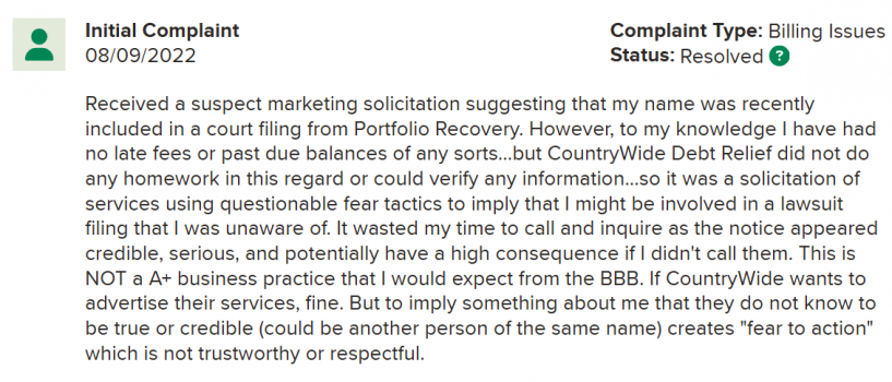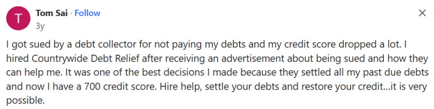 - Opinión Positiva: “Tenía muchas deudas que no podía pagar. Busqué en CountryWide. Cuando hablé con su servicio al cliente, fue bastante bueno y no tuve problemas. Cualquier pregunta que tenía, la respondían. Después de inscribirme, siempre di mis pagos a tiempo.”