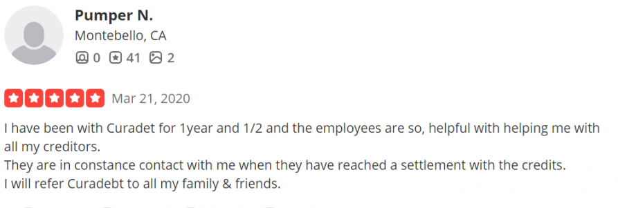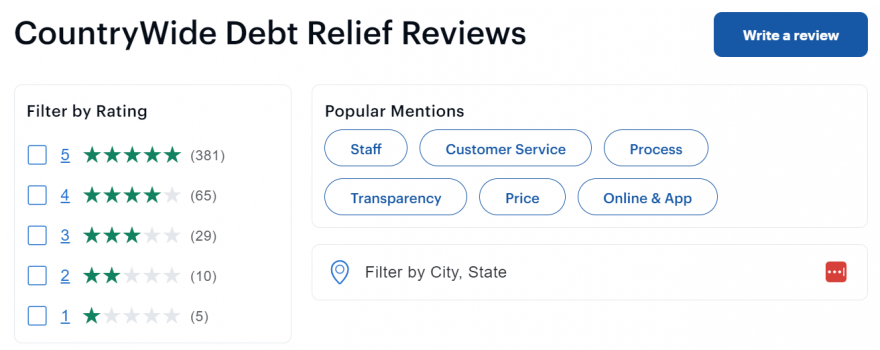 CountryWide Debt Relief tiene una buena calificación en Consumer Affairs, basada en más de 50 reseñas. Muchos clientes hablan muy bien del servicio al cliente y la efectividad del proceso de liquidación de deudas.