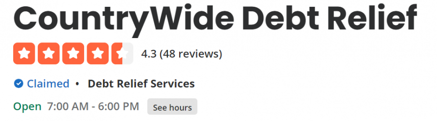 En Yelp, CountryWide Debt Relief también tiene una calificación promedio de 4.3 estrellas de 60 reseñas. Los usuarios tienden a estar satisfechos con el servicio proporcionado, aunque algunos tuvieron preocupaciones sobre la duración del proceso.