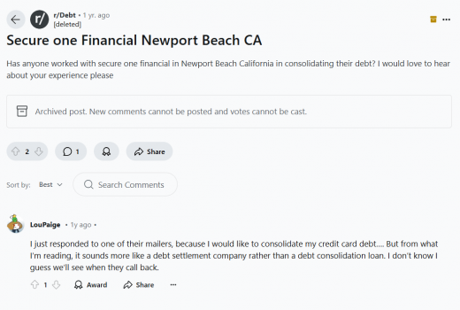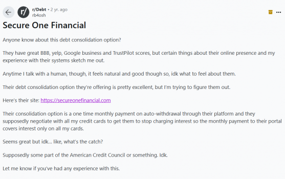 ¿Buscas más información? Plataformas como Reddit ofrecen relatos anecdóticos de lidiar con Secure One Financial. Hay opiniones mixtas, algunos usuarios en línea especulan que es una estafa, aunque muchos de estos individuos no han utilizado los servicios de la empresa. Un usuario compartió que decidió no trabajar con ellos porque sus soluciones no le convenían, pero que podría ser útil para alguien más en una situación diferente.