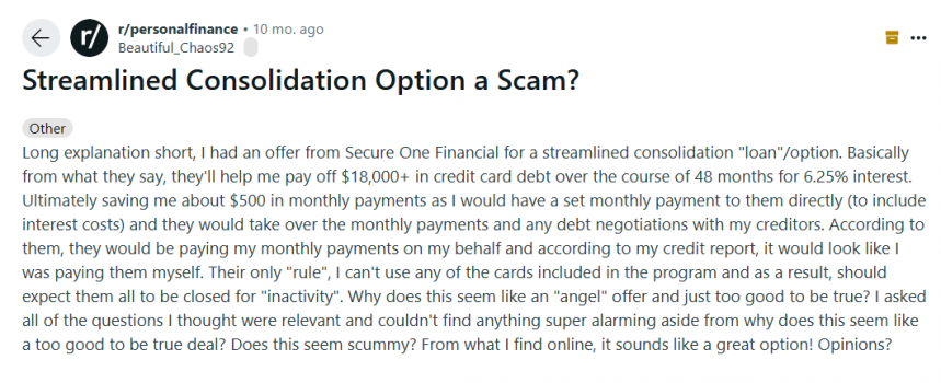 “Secure One es engañoso en su presentación y tergiversa su programa. Si estás en buena situación con tus acreedores, no te unas a este programa. Destruyen tu crédito mientras te acosan día y noche.”