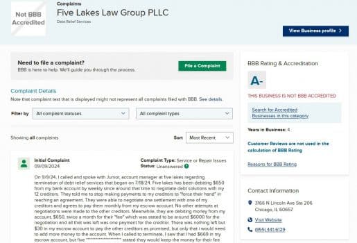 • BBB Complaints: Although Five Lakes maintains an A+ rating, many customers have lodged complaints. One customer said, “I felt misled about how much I would actually save, and it was hard to get anyone on the phone when I had questions.” These kinds of complaints indicate that while the company may offer effective services, transparency remains an issue for some.
