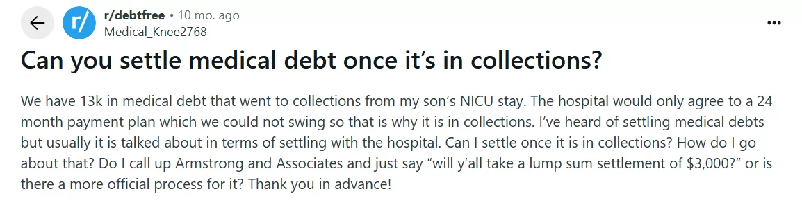 Below, we highlight a real discussion where someone asked whether they could still settle medical bills that a debt collector had already taken over. Spoiler: the answer is yes—along with some helpful advice from others who’ve been through it.