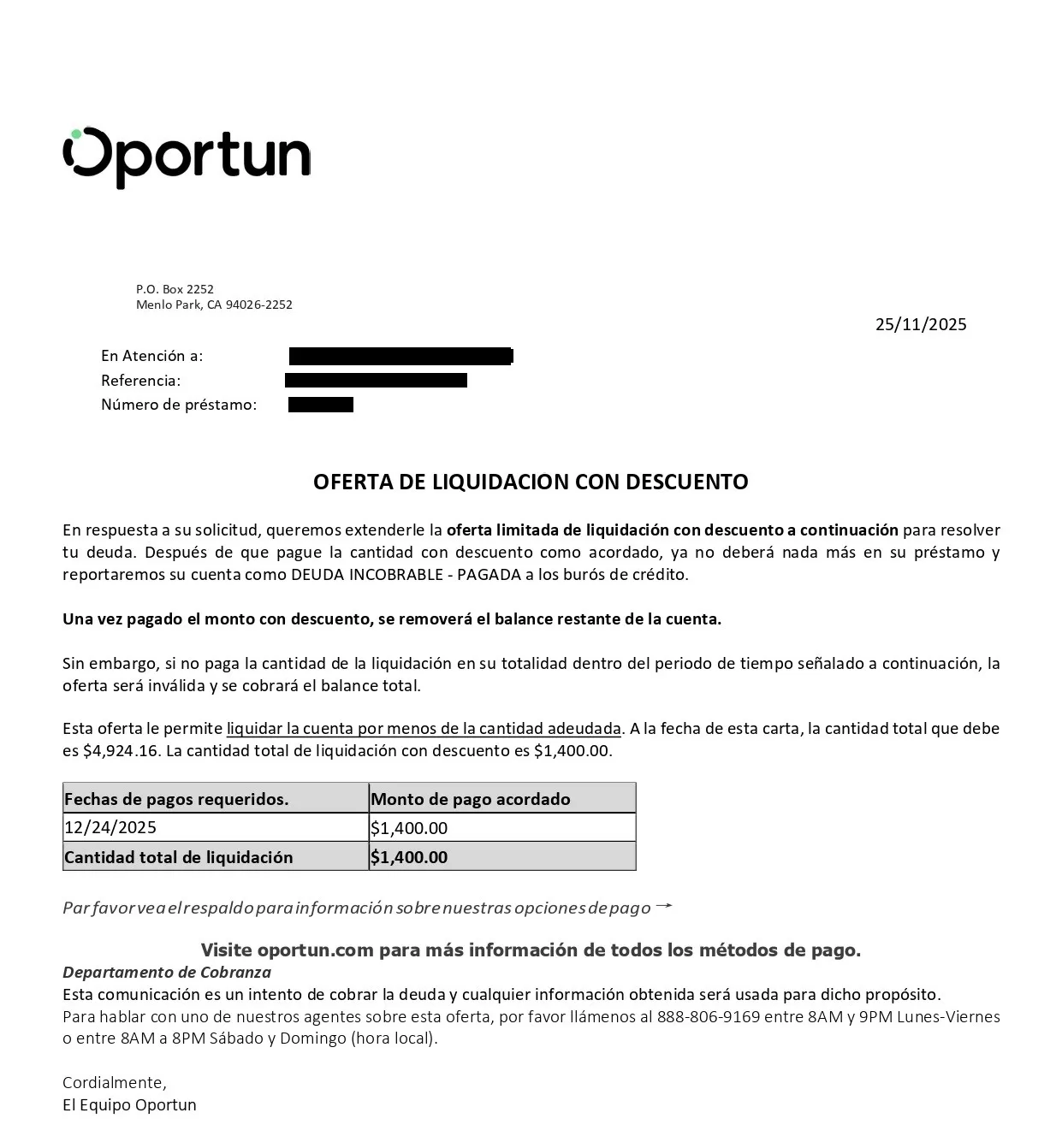 The following is a debt settlement letter for an account with Oportun. This particular creditor issued the letter in Spanish, but the information below reflects the final negotiated terms as received by the client. In the letter, you can see the final settlement resolution, where the client saved over 70%. They paid only $1,400 on a balance owed of $4,924.16.