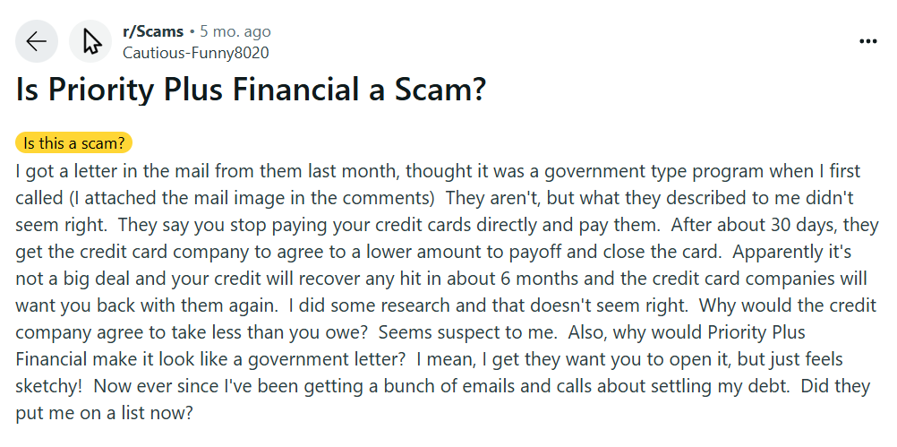 In one Reddit thread, a user shared their skepticism about Priority Plus Financial’s debt settlement offerings. The individual questioned the legitimacy of debt settlement services in general, expressing doubt over whether these services could truly negotiate lower balances. While some may hesitate to trust these services, many companies like Priority Plus Financial do work directly with creditors on behalf of their clients. It’s common for people to have varying comfort levels with debt relief options, and understanding each method can help in making the best decision.
