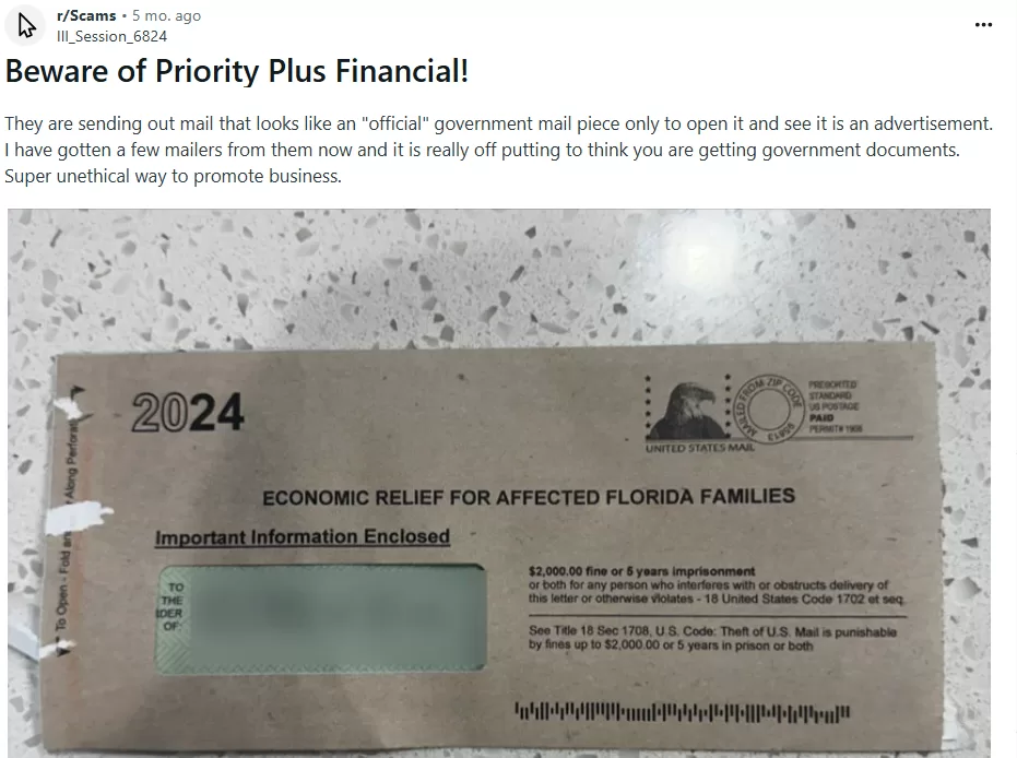 Another Reddit post described how Priority Plus Financial mailed promotional materials resembling government notices. The user felt this marketing approach was misleading.